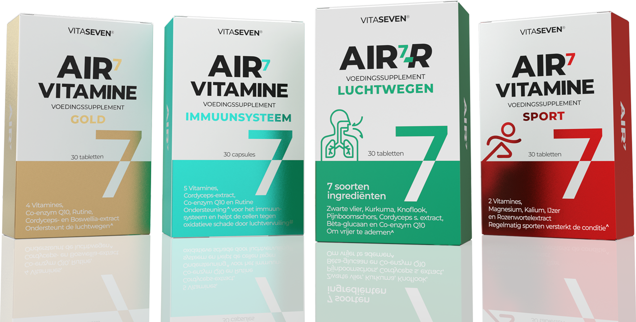 VITASEVEN AIR7 is een glutenvrij en lactosevrij supplement met Cordyceps-extract, Co-enzym Q10, Rutine en essentiële vitamines (A, B6, C, D3, E) voor een sterk immuunsysteem en verhoogde vitaliteit.